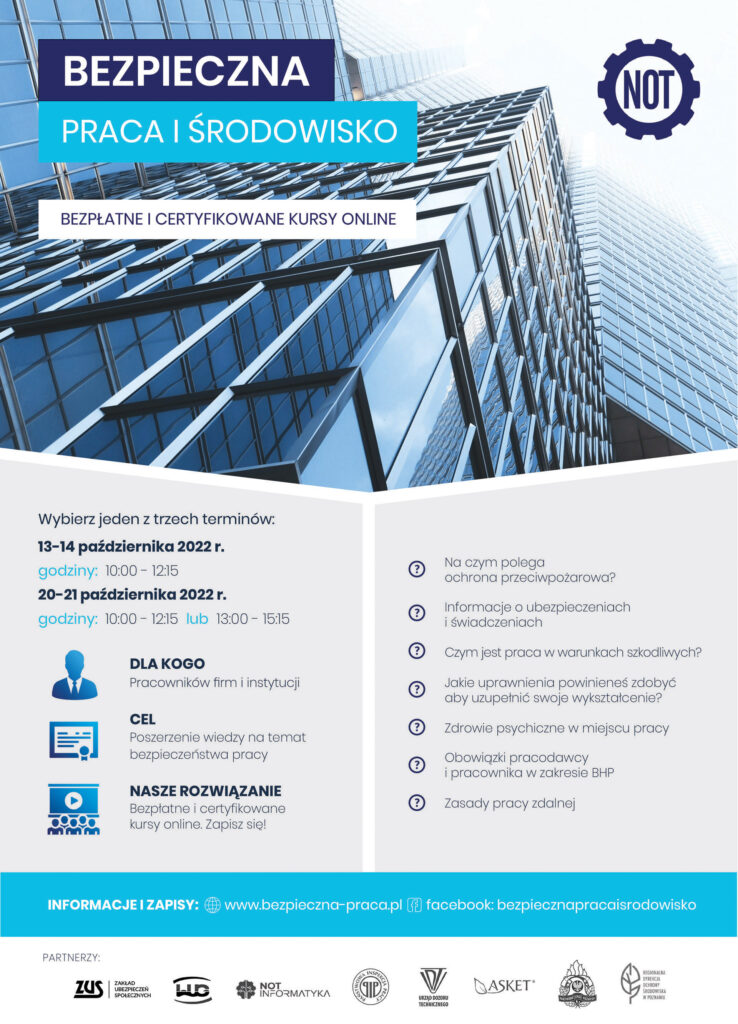 Wykłady poprowadzą specjaliści i praktycy z Państwowej Inspekcji Pracy, Państwowej Straży Pożarnej, Zakładu Ubezpieczeń Społecznych, Urzędu Dozoru Technicznego, Wyższego Urzędu Górniczego, Generalnej Dyrekcji Ochrony Środowiska.