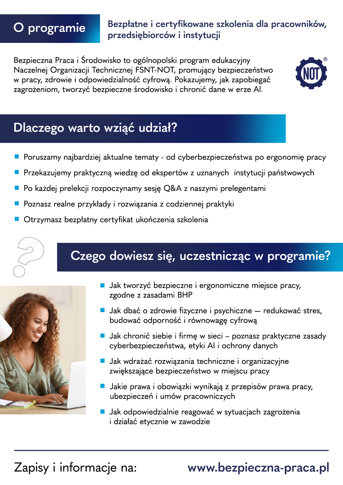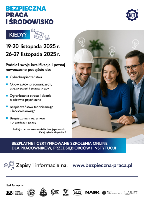 Federacja Stowarzyszeń Naukowo-Technicznych NOT wraz z Partnerami realizuje Program szkoleniowy „Bezpieczna Praca i Środowisko 2025”, skierowany do pracowników, przedsiębiorców oraz instytucji.