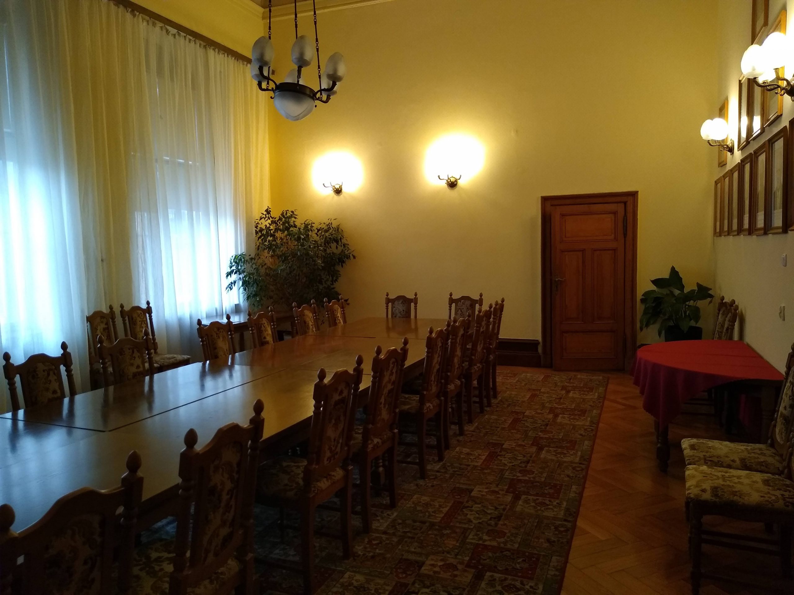 Wysoka, stylowa sala, zaaranżowana w układzie bankietowym z masywnymi stołami ułożonymi w jeden duży, prostokątny stół bankietowy dla uczestników spotkań, posiedzeń lub szkoleń dla kadry zarządzającej firm bądź organizacji.