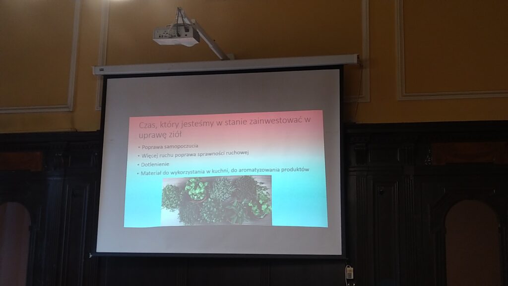 Mieliśmy okazję wysłuchać niezwykle interesujących wykładów i prezentacji osób z Dolnośląskiego Klubu Ekologicznego dotyczących między innymi radonu, bazaltów i ich pochodzeniu, a także unijnej drogi do naturalności klimatycznej. Nie zabrakło ciekawego wykładu prof. Anity Biesiady na temat uprawy ziół. Pani Profesor szeroko omawiała zioła oraz ich zastosowanie. Prowadząca pokazała i omówiła wybrane zioła.